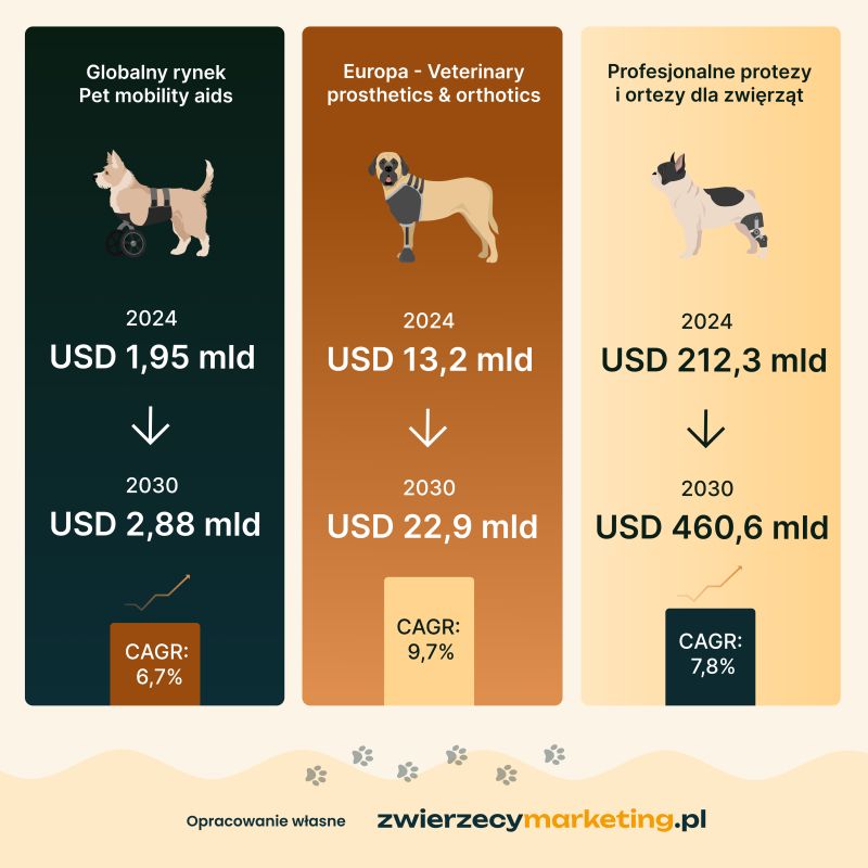Rynek „profesjonalnych” protez i ortez dla zwierząt globalnie także jest w fazie rozwoju: np. raport wskazuje wartość rynku na ~USD 212,3 mln w 2024 r. oraz przewidywaną wartość ~USD 420,6 mln do 2033 r. przy CAGR ~7,8 % (3).